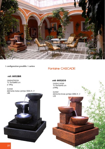 1 con guration possible: 1 carton Fontaine CASCADE réf: 8052BR couleur bronze réf: 8052CO *D: 70x70xH90 cm couleur corten p: 64kg *D: 70x70xH90 cm p:64kg à poser éléments inclus: pompe 1500L/H, 2 à poser LED éléments inclus: pompe 1500L/H, 2 LED 20